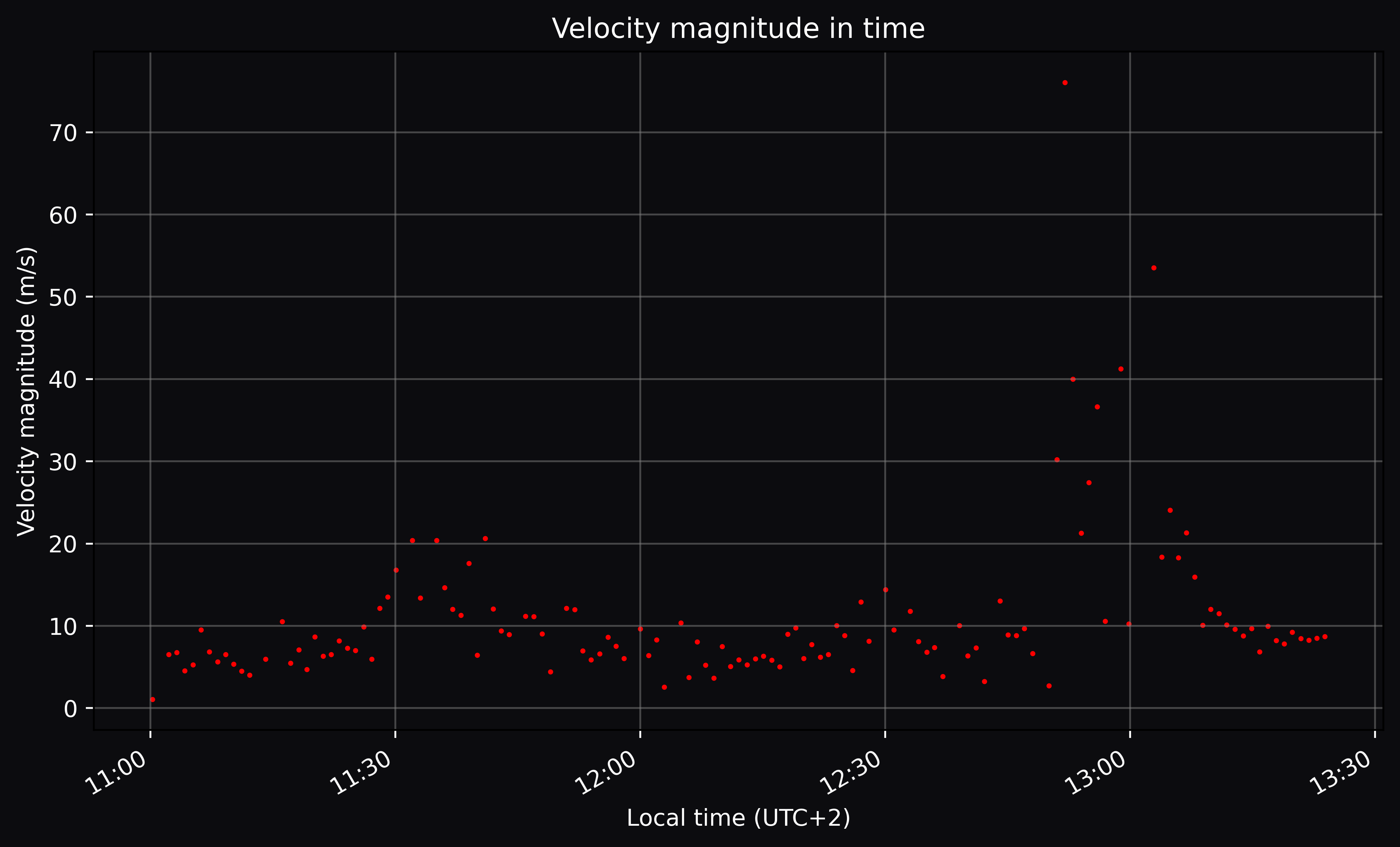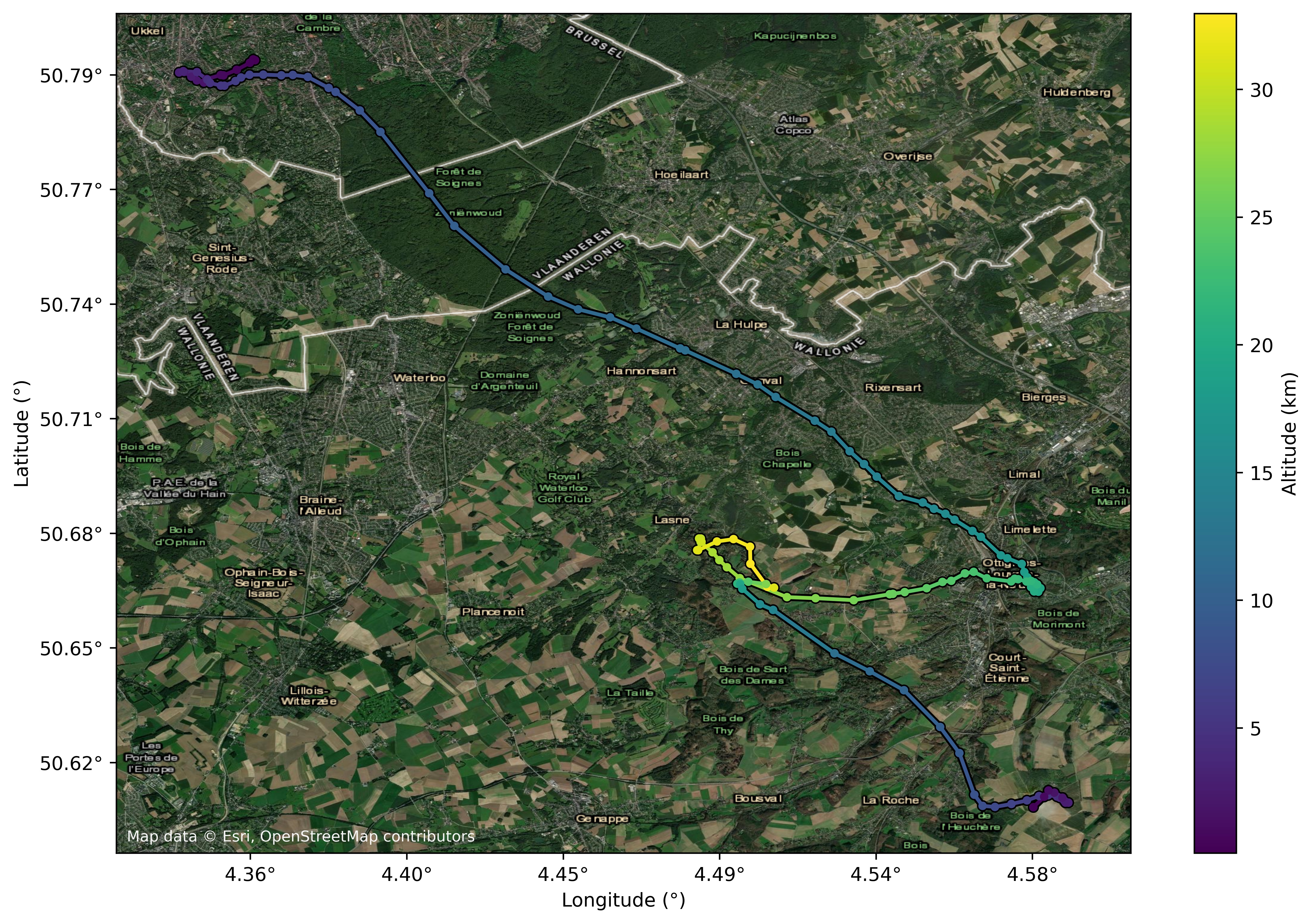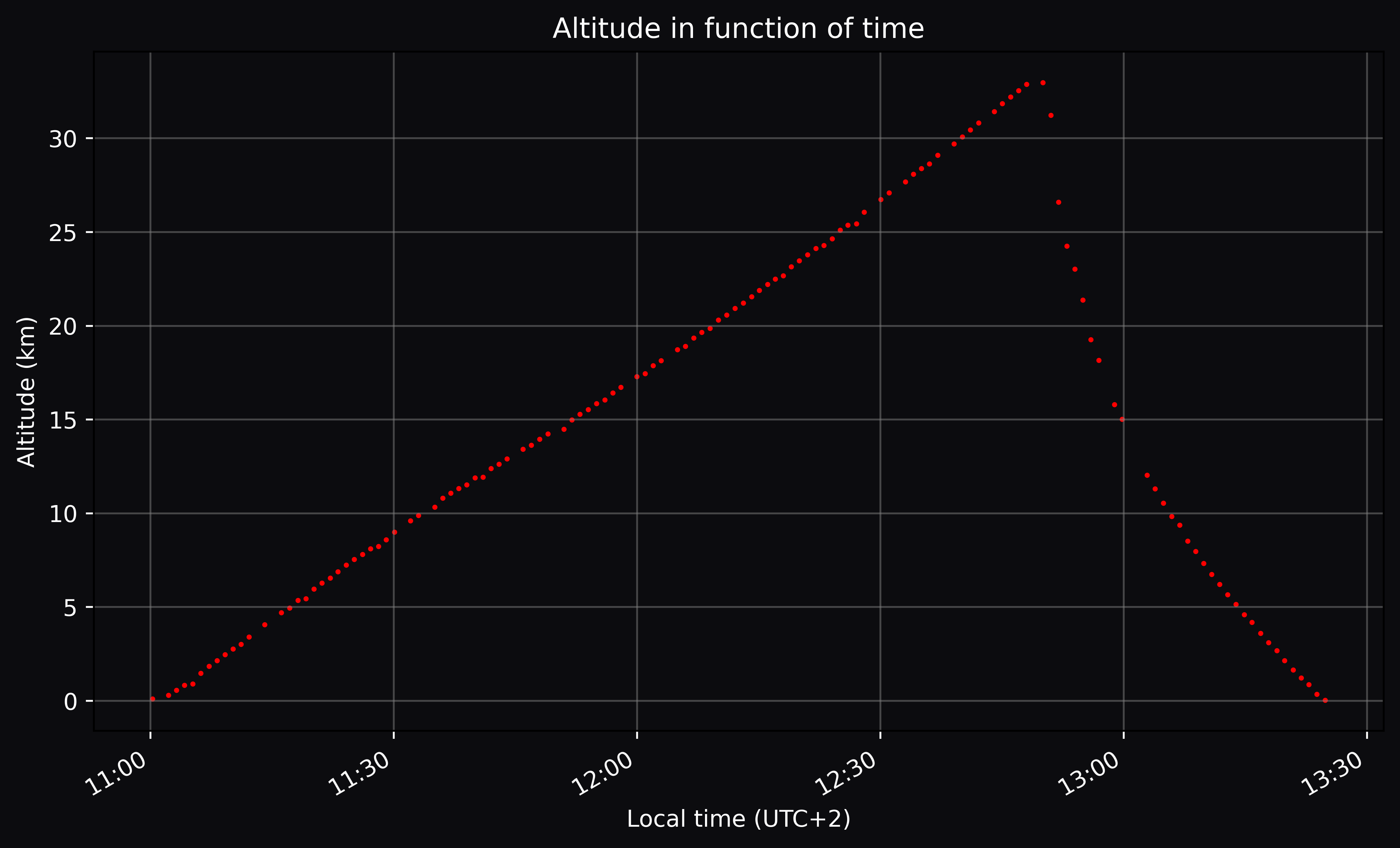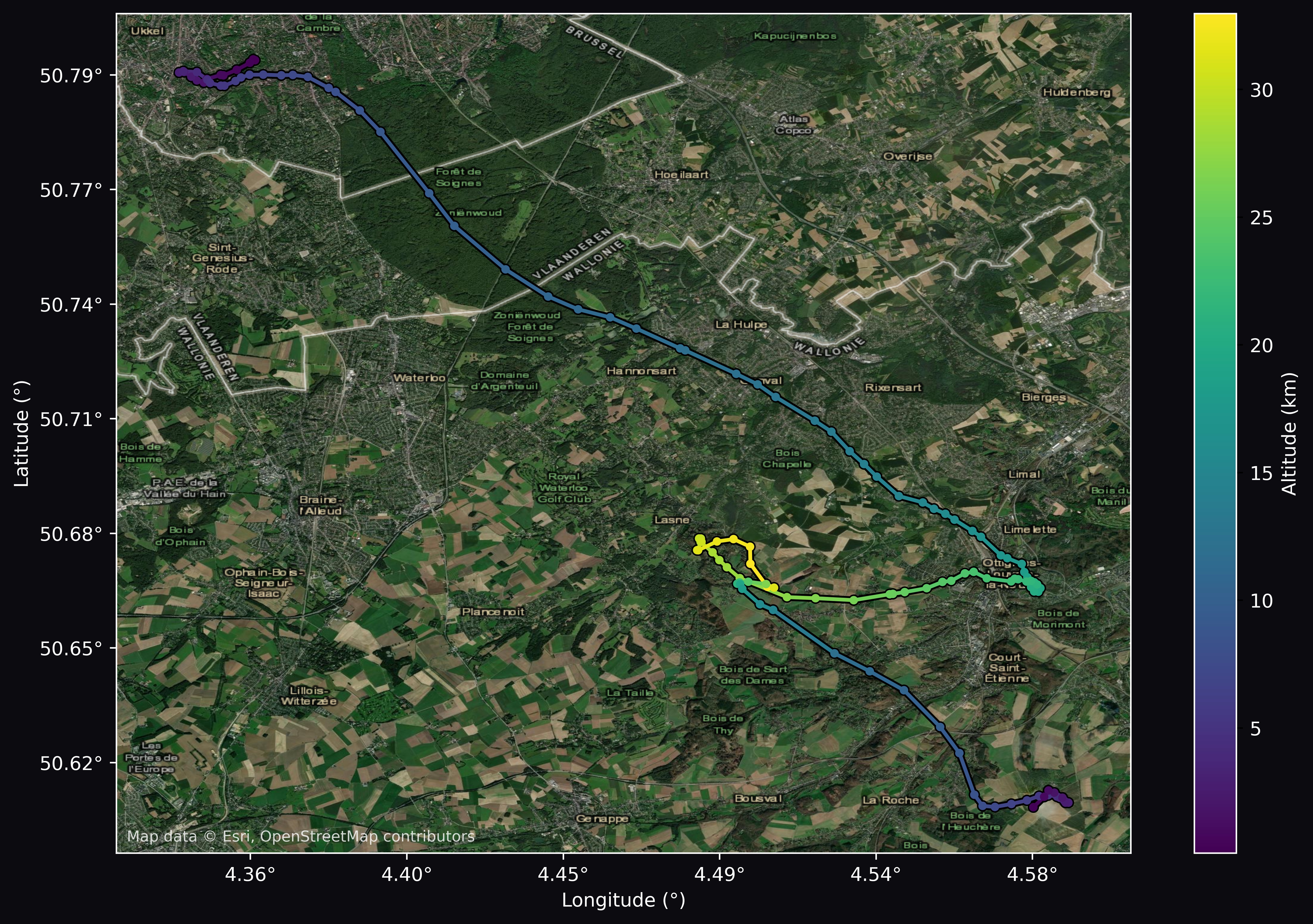 By analyzing the telemetry packets containing GPS coordinates and altitude, we reconstructed the 3D trajectory of the gondola. The plot clearly shows its southeasterly path, capturing the full journey of the flight from launch in Uccle to recovery in Court-Saint-Étienne.