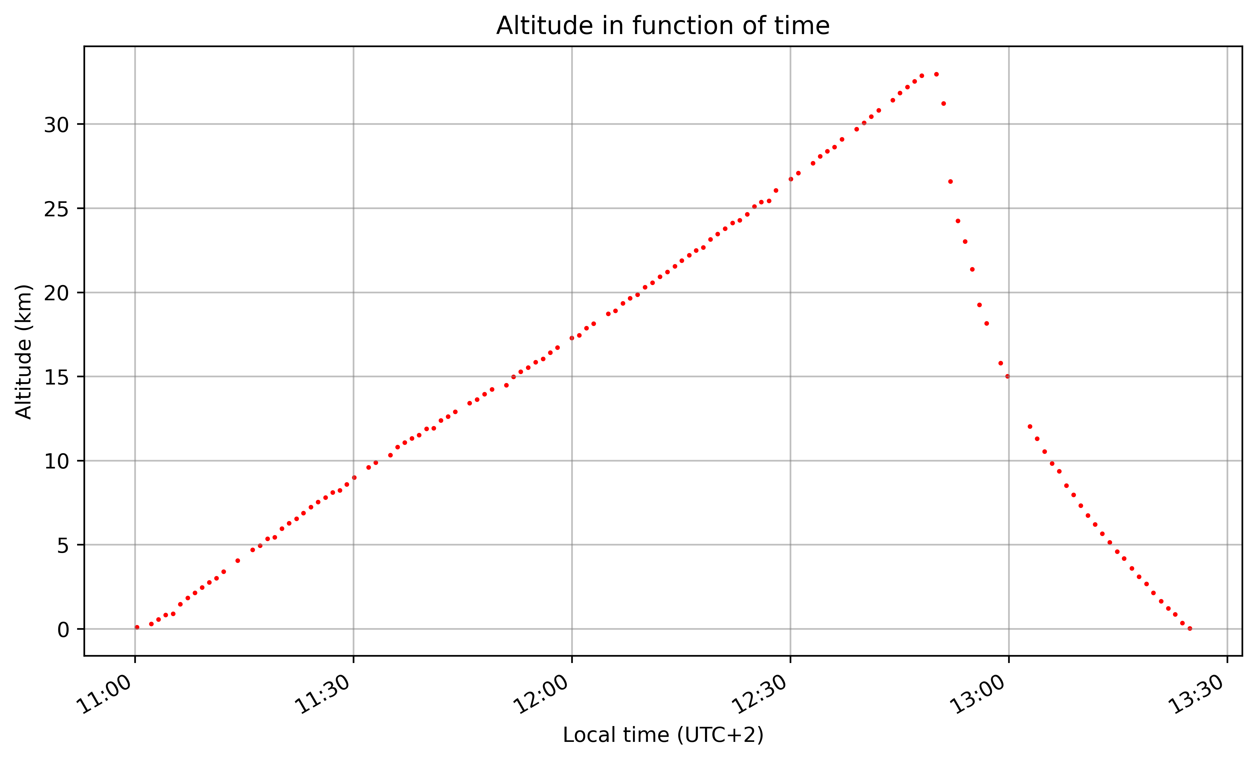The altitude (GPS) of the gondola steadily rises in function of flight duration until reaching a burst altitude of around $32.97 \,\mathrm{km}$ after flying for 1h50m, afterwards descending and making a safe landing on the ground.