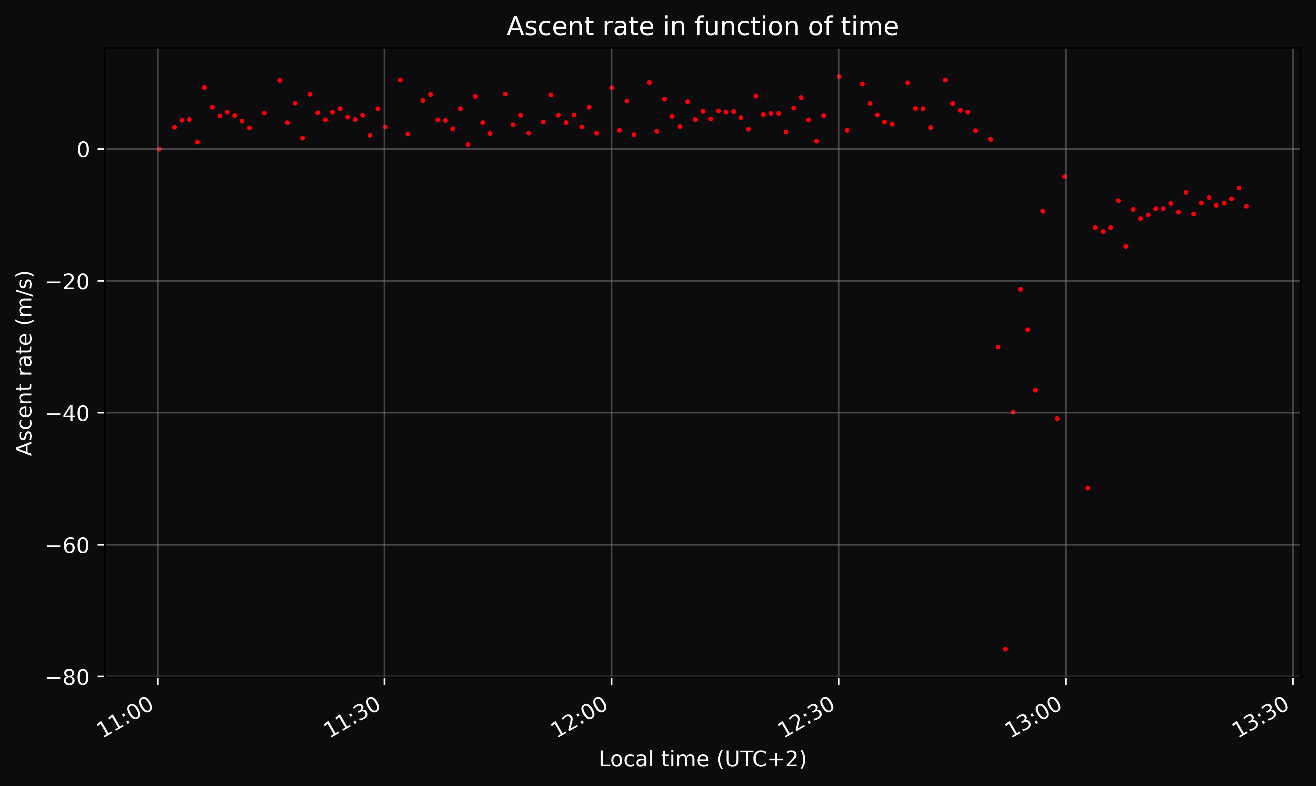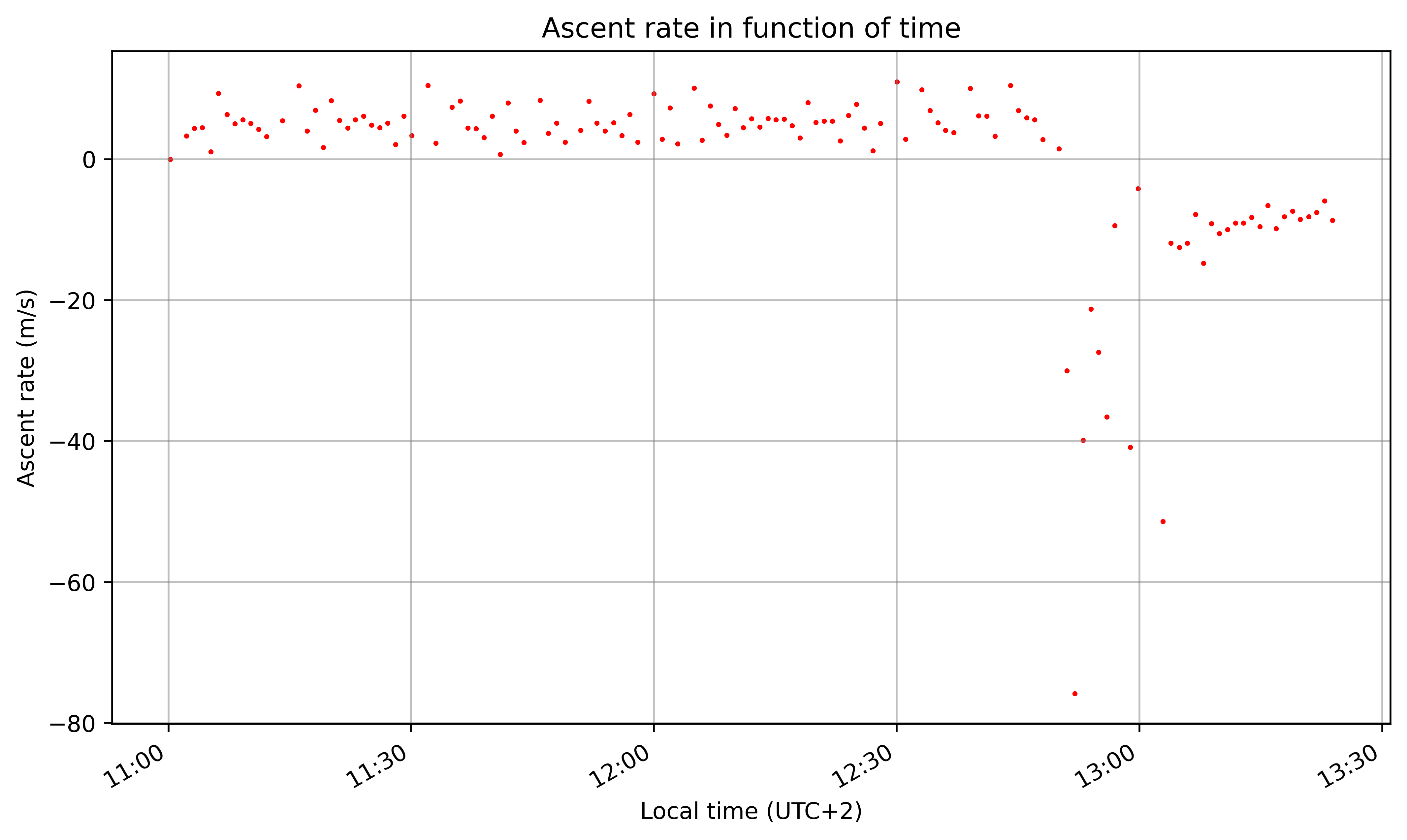\[v_{ascent, 1 \rightarrow 2} = \frac{h_2 - h_1}{t_2 - t_1}\]The ascent rate remains relatively constant throughout most of the balloon’s ascent before the balloon bursts and then dropping sharply near at the burst altitude. After reaching thicker regions in the atmosphere, the parachute slows down the descent.