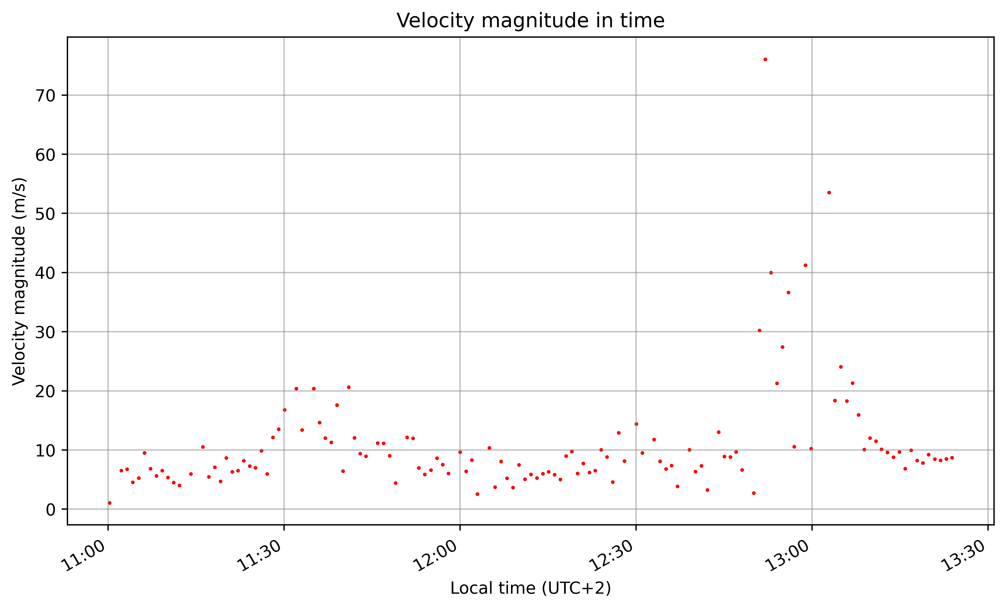 Dividing the ground distance travelled by the time interval between each packet gives the ground velocity. Using the ascent rate and ground velocity, the total velocity magnitude can be calculated as: